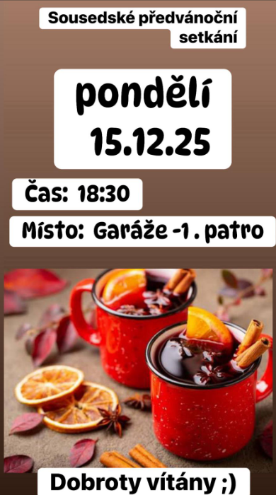 Sousedské setkání – pondělí 15.12.2025 18:30 hodin Publikováno 9.12.20259.12.2025 od Chaloupka Dobrý den, zveme Vás na tradiční předvánoční setkání v pondělí 15.12. v 18:30 v garážích -1. patro. V loňském roce byla překonána vysoko nasazena laťka z předchozího roku v kvalitě i kvantitě domácího cukroví a jiných pochutin 🙂 Výbor SVJ